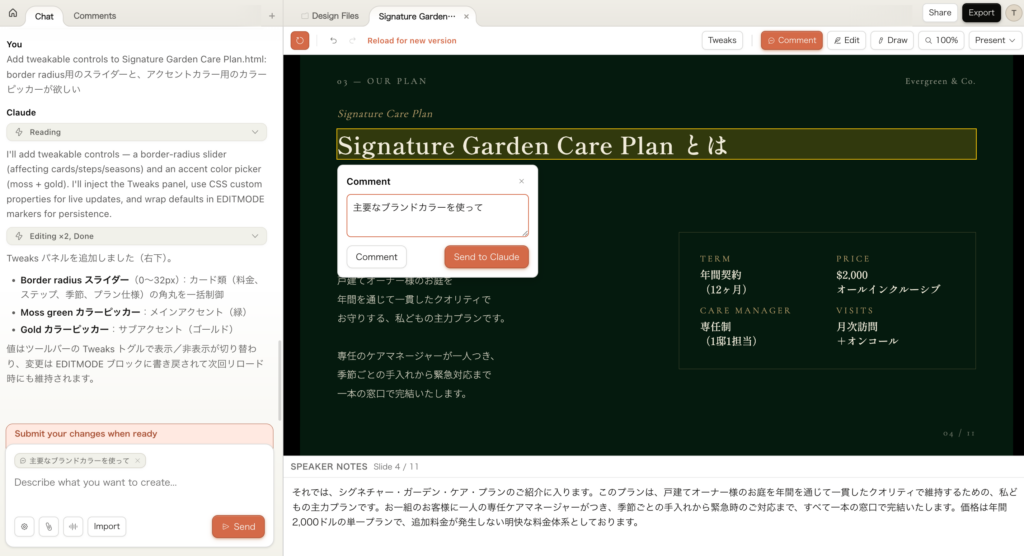 生成されたデッキに対して、どう手を加えるかがClaude Designの真骨頂です。キャンバス上部のツールバーには4つの編集ツールが並んでいます。