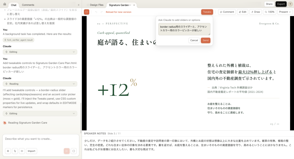 他のAIデザインツールで見かける「固定のスライダーパネル」と違って、ここは自分が欲しいコントロールをClaudeに作ってもらう仕組みになっています。例えば「border radius用のスライダーと、アクセントカラー用のカラーピッカーが欲しい」と依頼すると、Claudeがそのデザインに対してカスタムのコントロールを生成します。