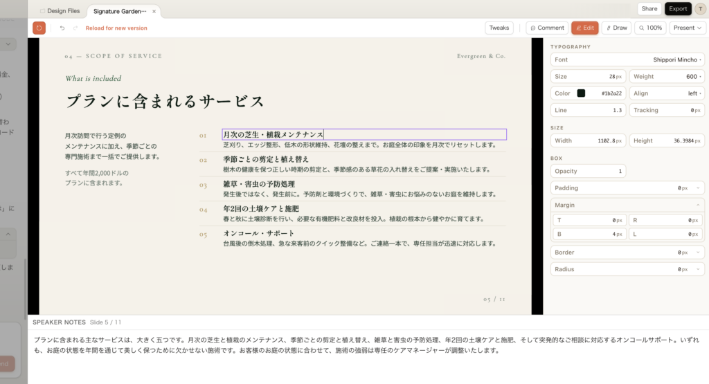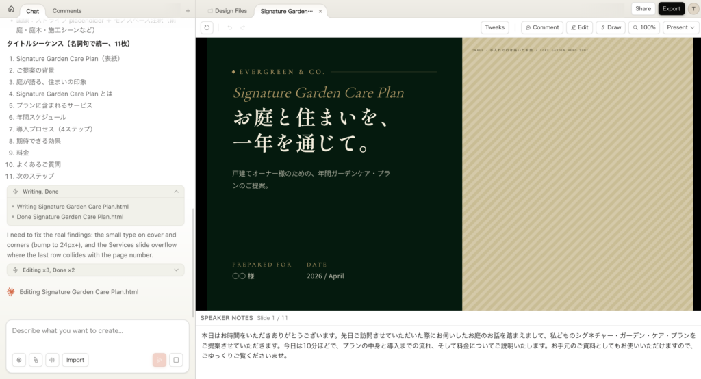 まずは比較的軽量なスライドデッキ作成から試します。例として、架空のランドスケープサービスの営業資料を作るシナリオを想定します。