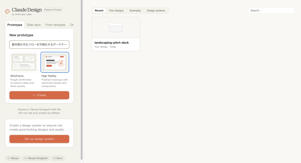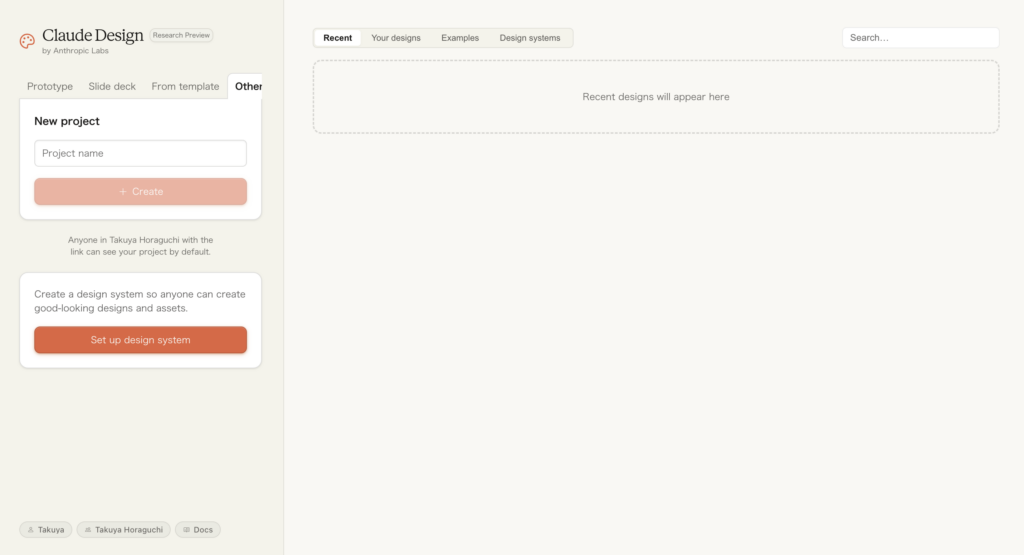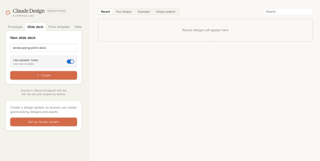 画面の設定にはデザインシステムのアップロード場所もあり、ここで自分のブランドやプロダクトのデザインシステムを事前に登録できます。この機能が、後述するようにClaude Designの差別化要素の1つです。