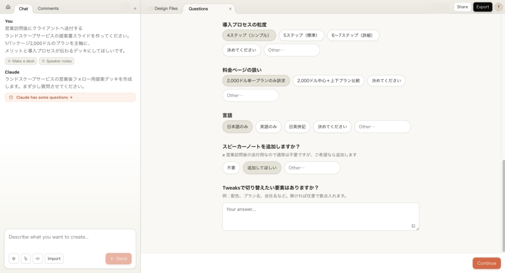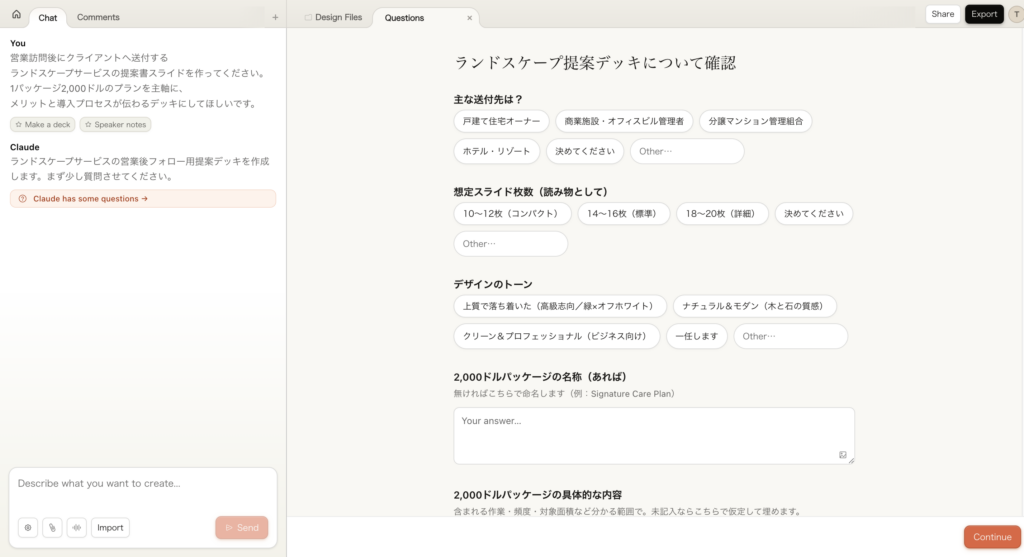 具体性はかなり重要です。「ピッチデッキをSaaS向けに作って」のような弱い指示だと汎用的なスライドが出てきてしまいます。対象顧客、トーン、構成の方針をなるべく書き込むと結果が段違いに良くなります。Claude側も不明点があればチャットで明確化の質問を返してきますので、必要に応じて追加情報を提供しましょう。