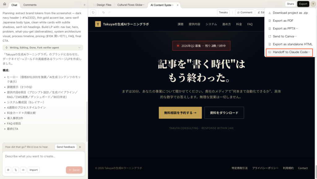 デザインがある程度固まったら、実装フェーズに移ります。ここでClaude Designの最もユニークな機能が登場します。**Claude Codeへのハンドオフ(Handoff)**です。