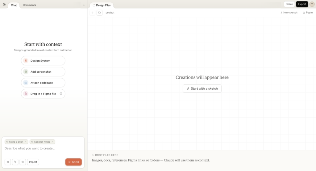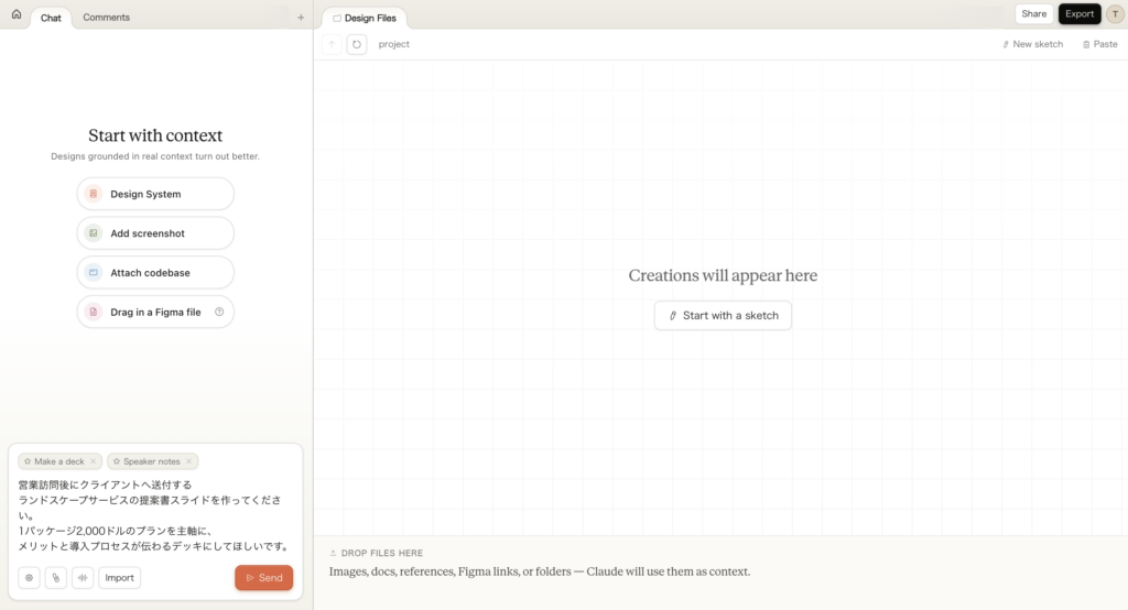 Claudeのヒントパネルも「Designs grounded in real context turn out better」と案内しており、できれば最初の生成前に何らかのコンテキストを付けておくのが推奨されます。何も付けないとブランド中立な汎用デザインになってしまいます。