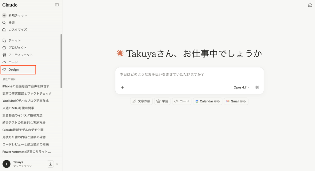 • claude.aiにログインし、左サイドバーの「Design」をクリックする