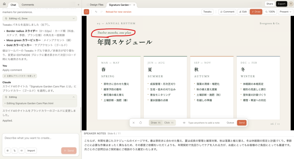 任意の要素にピンを打ってコメントを残せる機能です。例えばボタンをピン留めして「このボタンのパディングを大きくしてほしい」「主要なブランドカラーを使って」といった指示ができます。Claudeはピン留めされた要素とコメントを見て、そのスコープだけに修正を適用します。スライド全体に影響を及ぼさないので、細かい指示で便利です。