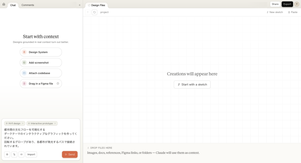 プロジェクト作成後、チャット画面に遷移します。左側がチャットペイン、右側がDesign Filesキャンバスで、初期状態では右側は空です。