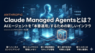 claude Claude Managed Agentsとは? — AIエージェントを「本番運用」するための新しいインフラ はじめに「AIエージェントのデモはうまくいった。でも本番に出すとなると……」AIエージェント開発に携わったことのある方なら、一度はこの壁にぶつかったことがあるのではないでしょうか。PoC(概念実証)の段階ではチャットベースで動くものをサクッ... 2026.04.14 claude
